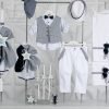 Christening suit Piccolino Lando-Bianco in White-Blue color. Includes blue vest with details, white cotton shirt with patterns, white cotton pants, bow tie with wooden detail, suspenders, scarf, and hat with headband. Available in 4 sizes 6-12, 12-18, 18-24, 24-36 (extra charge) Also available with a matching baptism package