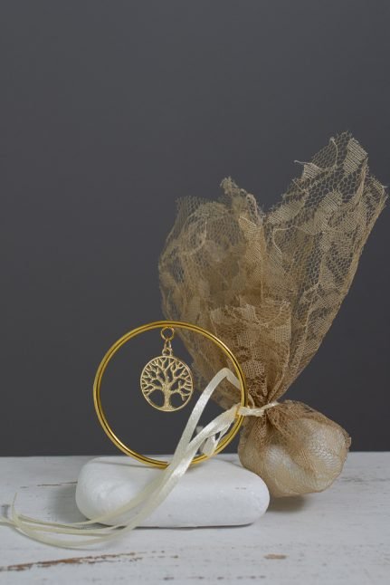 Circle wedding favor with hanging tree of life on a stone base. It is tied with chocolate lace and 2 3mm satin ribbons. The lace is available in ecru, white, chocolate, rotten apple and mint shades. Includes 3 Hadzigiannaki bundt pans in tulle wrapping. Height of tied favor box 17 cm Item dimensions 7*7 cm
