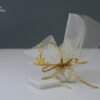 Piccolino Elena Champagne baptism dress. Impressive polka dot dress with embroidered tulle above tulle with champagne color glitter. Denim belt with a tie at the waist. The decor of the dress consists of handmade flowers. The dress is accompanied by a ribbon with a decor similar to the dress. Available in 4 sizes: 6-12, 12-18, 18-24, 24-36 (extra charge). Also available in ivory shade.