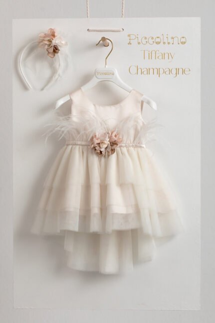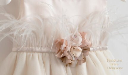 Piccolino Tiffany Champagne Christening Gown. Midi dress with satin bodice. Belt from lace and marabou feathers decorated with handmade flowers. Tulle skirt with ruffles in 3 levels with long queues. At the back, the large tied lace bow impresses. The dress accompanied by a stand with a decor similar to the dress. Available in 4 sizes: 6-12, 12-18, 18-24, 24-30 (extra charge) It can also be combined with baptism sets.