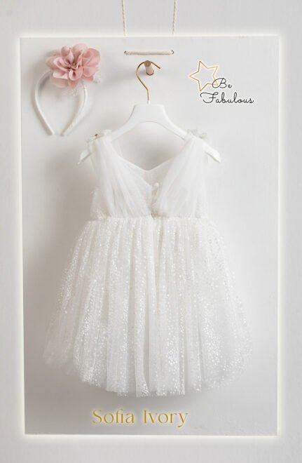 Be Fabulous Sofia Ivory baptism dress. Tulle bodice with a special glitter design with a sweetheart neckline and a tulle design that starts from the shoulders and ends at the waist, with two bows on the shoulders with glitter and swarovski rhinestones. The decor of the dress consists of an impressive handmade flower with swarovski rhinestones. The dress is accompanied by a dress with a decor similar to the dress. Available in 4 sizes: 6-12, 12-18, 18-24, 24-36 (extra charge)