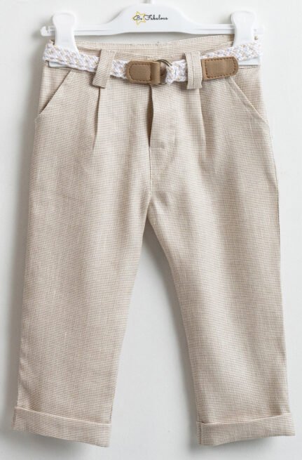 Be Fabulous Oliver christening suit in Beige color. Includes beige linen waistcoat, ivory linen shirt, beige pleated linen trousers, linen bow tie, belt and hat with headband.
