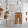 Baptismal suit that includes trousers in tail color, vest with special fabric, white shirt, matching bow tie, suspenders, scarf and hat.
