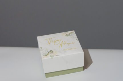Favor box with printed eucalyptus theme, couple names and wedding date.