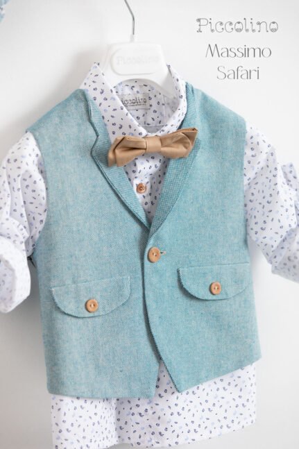 It includes a black linen vest with a pedal, a white cotton shirt with patterns, cotton pants in safari color, a one-way bow tie with a tip at the end, a scarf, a belt with double D binding and a hat with a bezel.