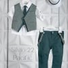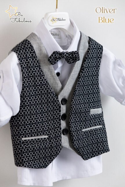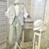 It includes a cotton vest in shades of blue-white, a cotton white shirt, linen trousers with pleats in shades of blue-white, a fabric bow tie, a belt and a hat with a bezel.