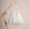 Dress made of ecru tulle with embroidered colorful flowers. Back with crisscross straps and a light colored belt that ends in a carefree bow at the back. The decor of the dress consists of handmade flowers, beads and boho lace.