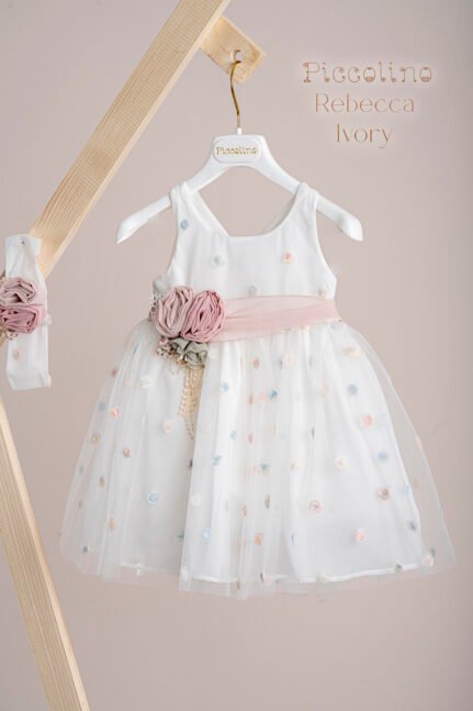 The dress is accompanied by a ribbon with decor similar to the dress.