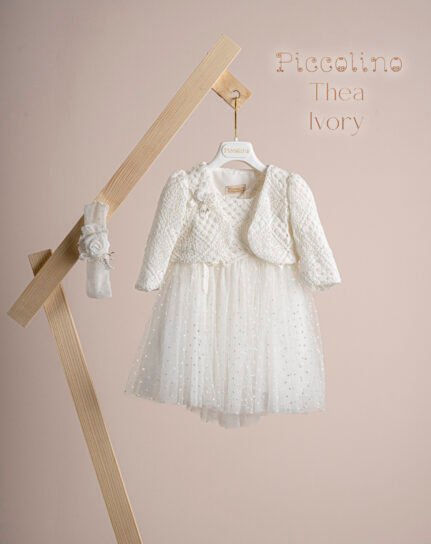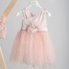 Dress made of ecru knitted lace on the bodice and ecru polka dot tulle skirt. Back with crisscross fastening from the straps. The decor of the dress consists of a handmade flower.