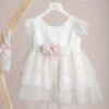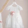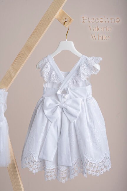 Dress made of white garden lace on the bodice and ecru garden lace with a beautiful finish on the skirt. Back with crisscross straps and lace sleeves. The back of the dress is decorated with a romantic bow. The decor of the dress consists of a lace belt and a small discreet bow. The dress is accompanied by a bandana with a decor similar to the dress.