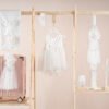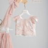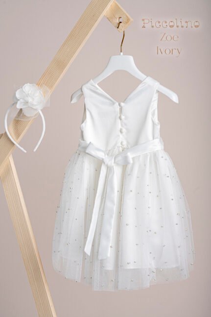 A midi dress with a particularly charming bodice with satin pleats and a satin belt that ends in a bow tie at the back. Impressive asymmetrical tulle skirt with pearls, with a longer back. The dress’s decor consists of a handmade flower, rhinestones and marabou.