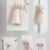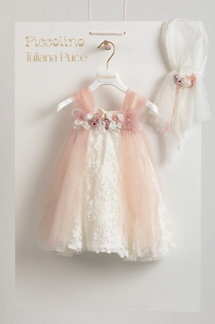 The dress is accompanied by a bandana with a decor similar to the dress. Available in 3 sizes: 6-12, 12-18, 18-24, 24-36 (extra charge) A matching baptism set is also available.