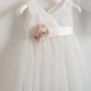 Beautiful off-white christening gown with embossed pink flowers and soft shimmer ending in a round tail. Includes cardigan and bandana.