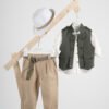 Περιλαμβάνει military, λινό, γιλέκο με διακοσμητικά μεταλλικά κουμπια , πουκάμισο mao λινό εκρού, παντελόνι λινό βράκα με πιέτες, ζώνη και καπέλο με φάσα.