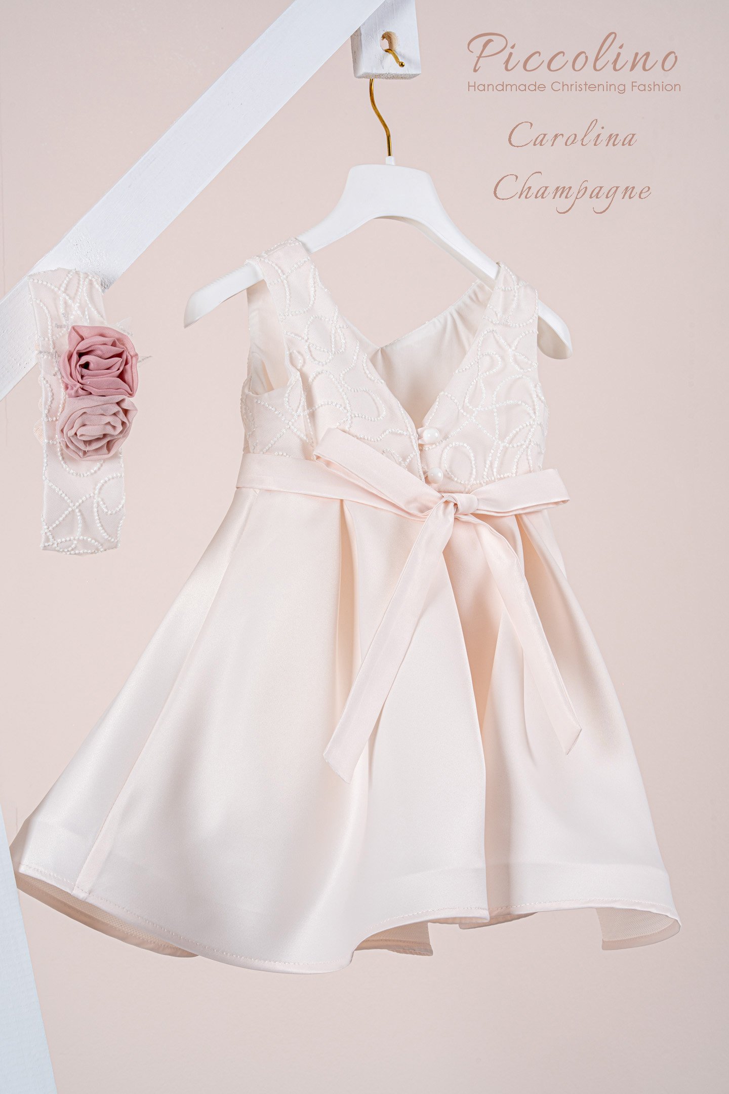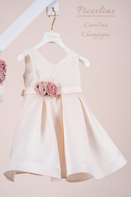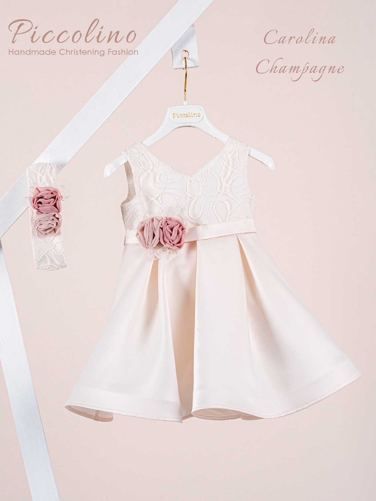 | Βαπτιστικό φόρεμα Piccolino Carolina Champagne. Ένα εντυπωσιακό chic φόρεμα από σατέν ύφασμα. Μπούστο με λαιμόκοψη σε σχήμα καρδιάς και επίστρωση λαμπερής δαντέλας με γκλίτερ. Φούστα από σατέν ύφασμα που σχηματίζει πιέτες κάνοντας το φόρεμα μοναδικά ξεχωριστό. Το ντεκόρ του φορέματος αποτελείται από σατέν ζωνάκι και σύνθεση με χειροίητα λουλούδια. Το φόρεμα συνοδέυεται απο κορδέλα με ντεκόρ όμοιο με το φόρεμα. Διαθέσιμο σε 4 μεγέθη: 6-12, 12-18, 18-24, 24-36(εξτρά χρέωση). |