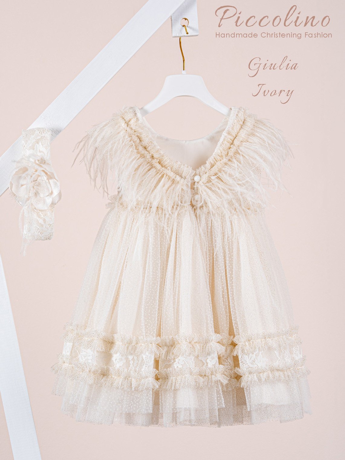 | Βαπτιστικό φόρεμα Piccolino Giulia Ivory. Εντυπωσιακό ιβουάρ φόρεμα με χρυσές λεπτομέρειες. Ρομαντικό μπούστο από δαντέλα και τούλι με γκλίτερ κάτω από αυτήν, μανικάκι με πούπουλα μαραμπού και λεπτομέρεια από τούλι με χρυσό γκλίτερ. Η φούστα του φορέματος αποτελείται από πουά τούλι και τούλι με γκλίτερ από κάτω, βολάν από τούλι με γκλίτερ και λεπτομέρεια με δαντέλα όμοια με το μπούστο. Εξίσου εντυπωσιακή είναι και η πλάτη του φορέματος που σχηματίζει V κάνοντας σούρα με τούλι γκλίτερ και πούπουλα μαραμπού. Το ντεκόρ του φορέματος αποτελείται από χειροποίητο λουλούδι. Το φόρεμα συνοδεύεται απο κορδέλα με ντεκόρ όμοιο με το φόρεμα. Διαθέσιμο σε 4 μεγέθη: 6-12, 12-18, 18-24, 24-36(εξτρά χρέωση) |
