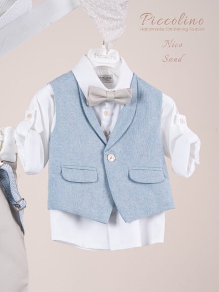 | Βαπτιστικό κοστούμι Piccolino Nico σε χρώμα Sand. Περιλαμβάνει γιλέκο μονόκουμπο με πέτο, πουκάμισο βαμβακερό λευκό, παντελόνι βαμβακερό σε χρώμα Sand, παπιγιόν, τιράντες και καπέλο με φάσα. Διαθέσιμο σε 4 μεγέθη 6-12, 12-18, 18-24, 24-36(εξτρά χρέωση) Συνδυάζεται και με ασορτί πακέτο βάπτισης. |