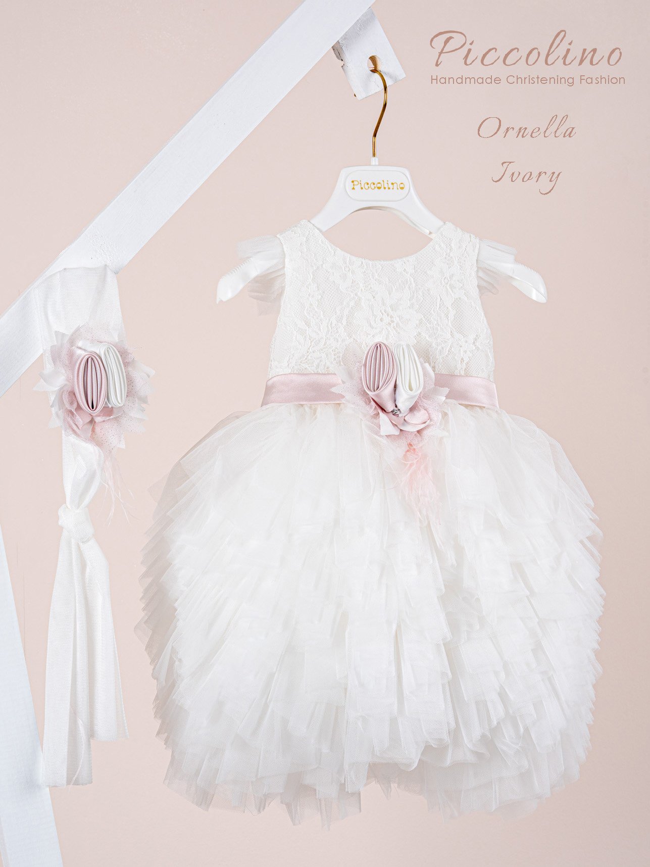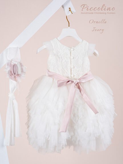 | Βαπτιστικό φόρεμα Piccolino Ornella Ivory. Μεσάτο φόρεμα με τούλινο μανικάκι . Μπούστο με δαντέλα, στο φόρεμα ξεχωρίζει η εντυπωσιακή του ασύμετρη τούλινη φούστα με τα πολλά διαφορετικά της επίπεδα. Το ντεκόρ του φορέματος αποτελείται από σατέν ζωνάκι που καταλήγει σε φιογκάκι στο πίσω μέρος, χειροποίητα λουλούδια και πούπουλα μαραμπού. Το φόρεμα συνοδέυεται απο μπαντάνα με ντεκόρ όμοιο με το φόρεμα. Διαθέσιμο σε 4 μεγέθη: 6-12, 12-18, 18-24, 24-36(εξτρά χρέωση) |