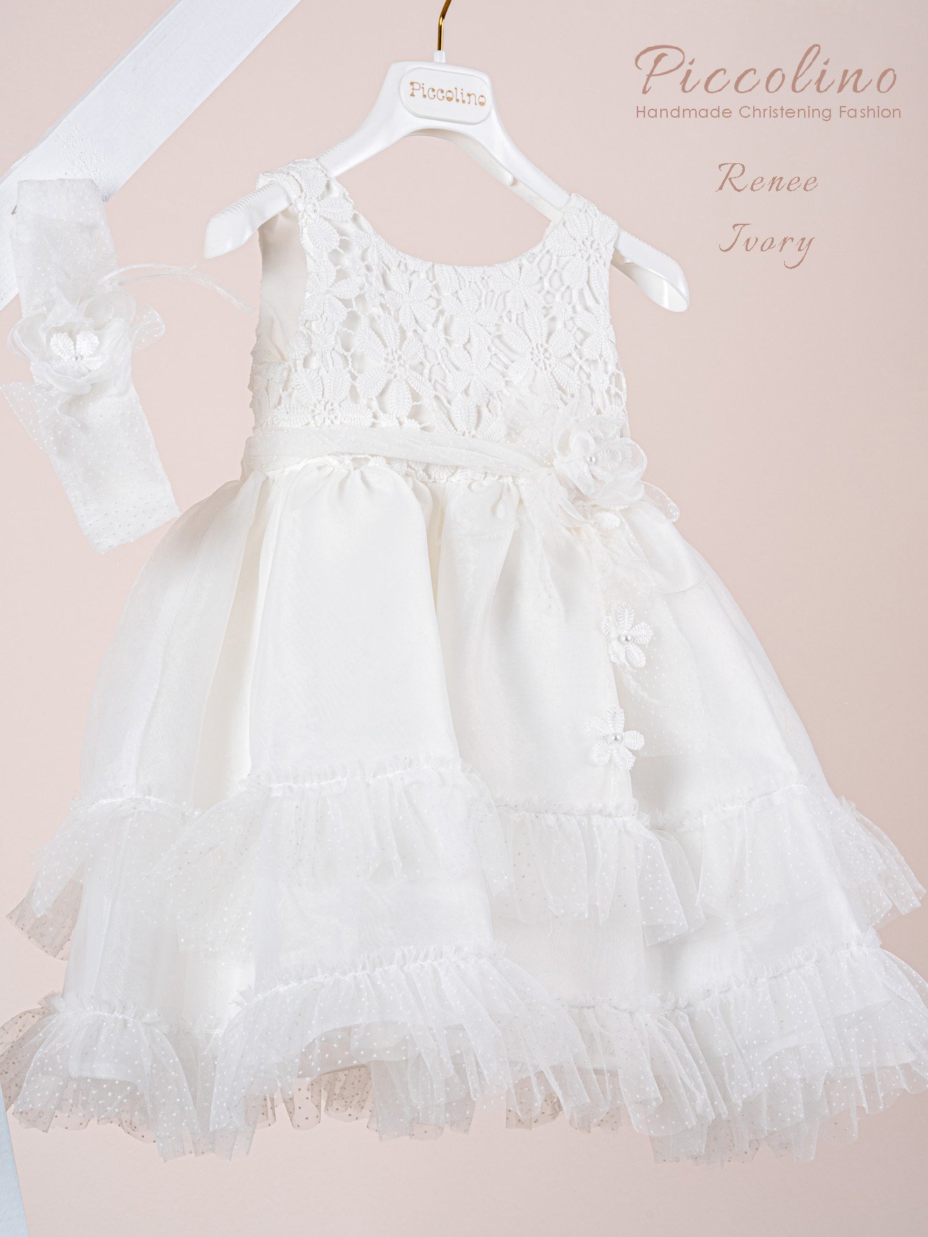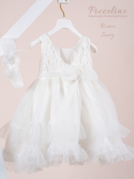 | Βαπτιστικό φόρεμα Piccolino Renee Ivory. Ρομαντικό μεσάτο φόρεμα με μπούστο από εντυπωσιακή δαντέλα με λουλούδια και πλούσια φούστα από οργάντζα με βολάν από πουά τούλι. Το ντεκόρ του φορέματος αποτελείται από σύνθεση με λουλούδια της δαντέλας και ζωνάκι από πουά τούλι που καταλήγει σε φιόκο στο πίσω μέρος. Το φόρεμα συνοδεύεται απο κορδέλα με ντεκόρ όμοιο με το φόρεμα. Διαθέσιμο σε 4 μεγέθη: 6-12, 12-18, 18-24, 24-36(εξτρά χρέωση). |