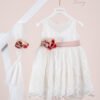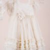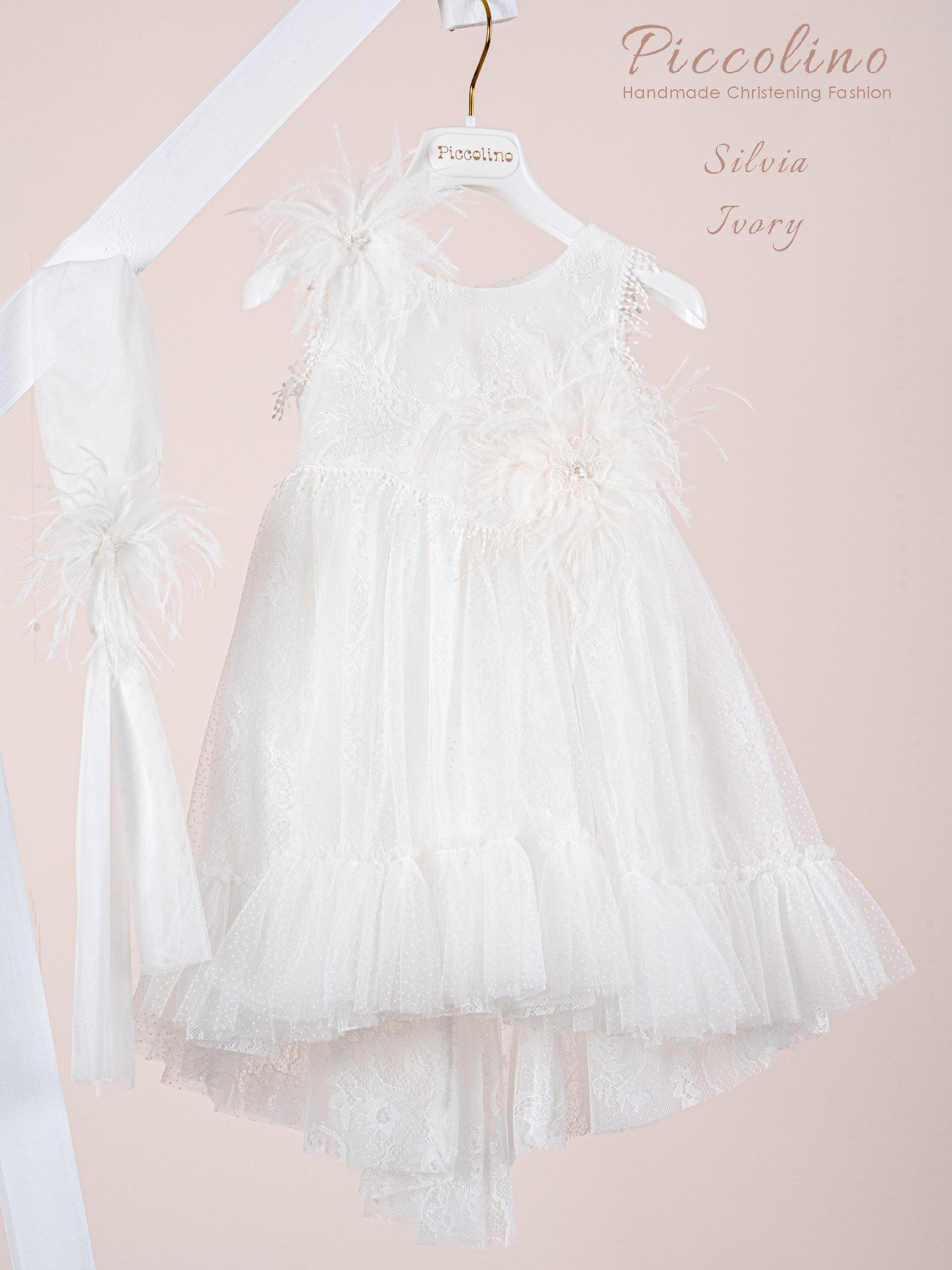 | Βαπτιστικό φόρεμα Piccolino Silvia Ivory. Φόρεμα από δαντέλα εξωτερικά και τούλι με ψιλό πουά εσωτερικά. Μπούστο με ιδιαίτερο κόψιμο που καταλήγει σε μύτη μέσα στην φούστα. Ιδιαίτερη πλάτη με εντυπωσιακό άνοιγμα κάνοντας ελαφρυά διαφάνεια με το πουά τούλι. Ασσύμετρη φούστα με βολάν, μακρυά στο πίσω μέρος. Δαντέλα με κρόσια διακοσμεί τα τελειώματα στο μπούστο. Το ντεκόρ του φορέματος αποτελείται από χειροποίητα λουλούδια και πούπουλα μαραμπου. Το φόρεμα συνοδέυεται απο μπαντάνα με ντεκόρ όμοιο με το φόρεμα. Διαθέσιμο σε 4 μεγέθη: 6-12, 12-18, 18-24, 24-36(εξτρά χρέωση) |